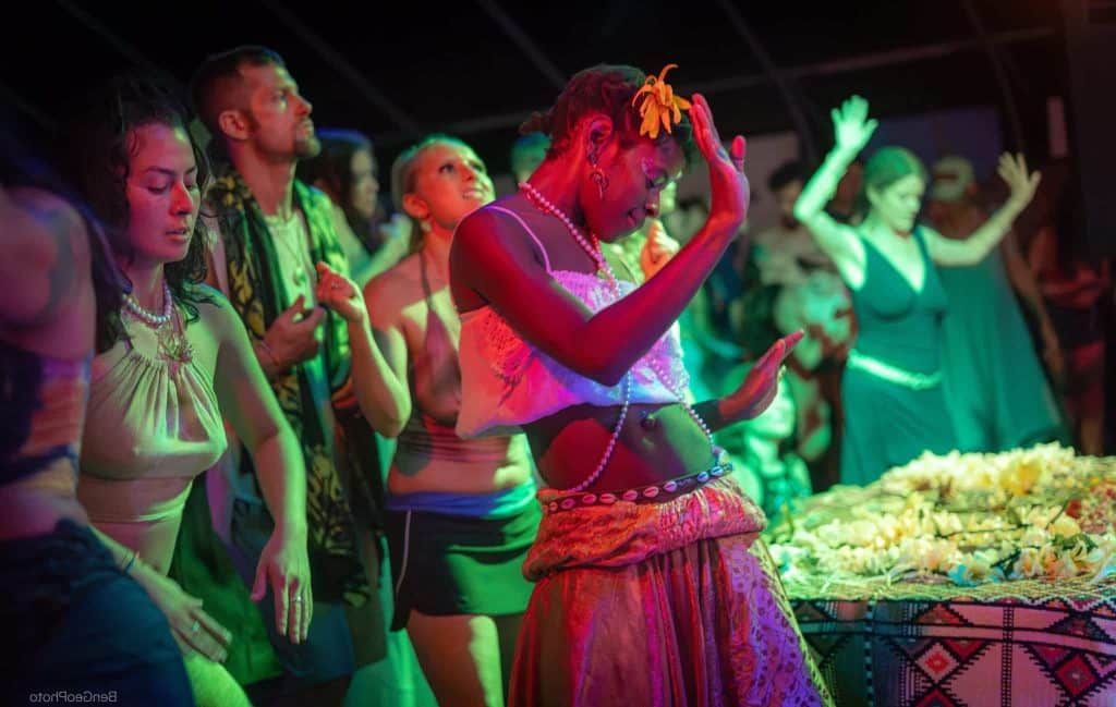 Sacred movement practices, such as ecstatic dance, yoga, pilates or qigong, can stimulate the release of endorphins, which act as natural painkillers and mood elevators.